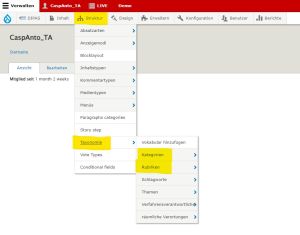 Hier bestimmen Sie, welche Kategorien und Typen den Bürger*innen in Ihrem Verfahren bei der Beitragseingabe zur Verfügung stehen sollen (hier im Bild im Menü blau markiert). Das macht in der Regel erst dann Sinn, wenn es ein konkretes Verfahren gibt, das erstellt werden soll.
